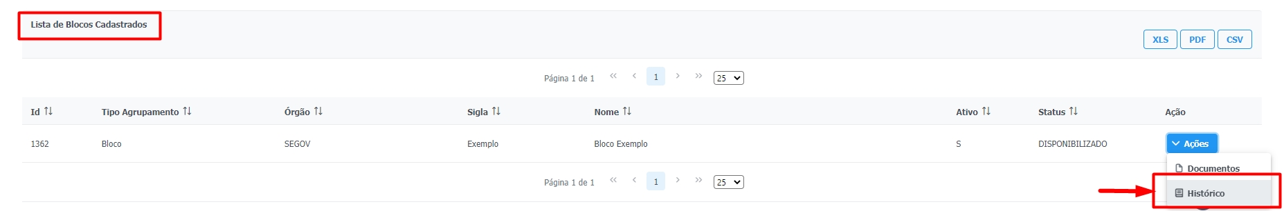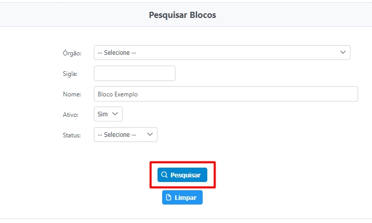 Preencha os campos de pesquisa para encontrar o bloco desejado e clique em
