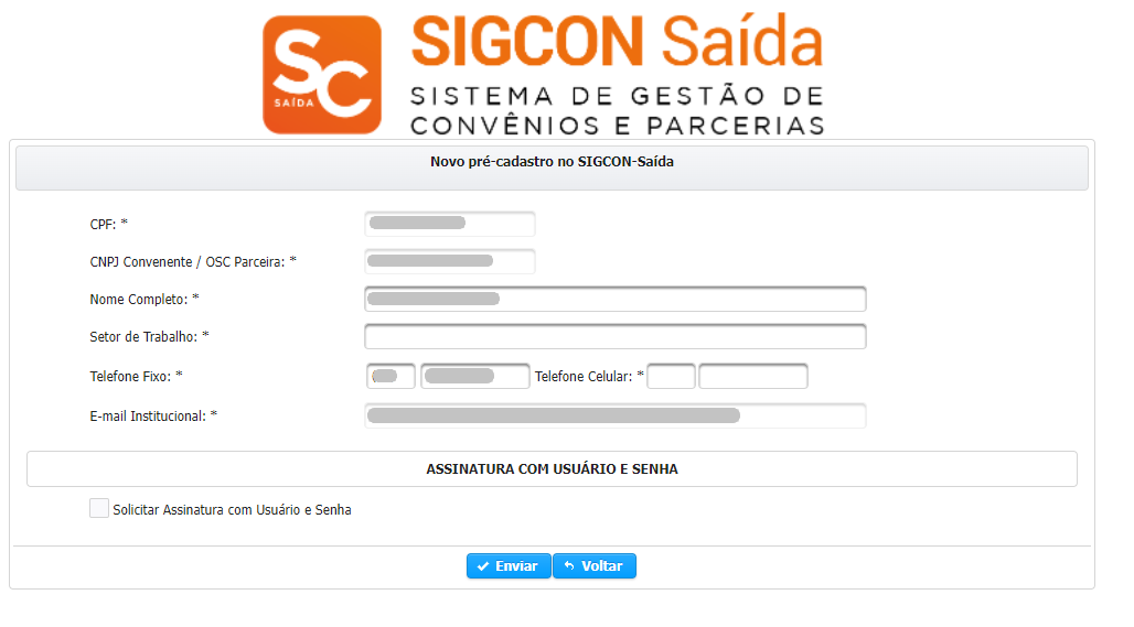 Preencha todos os campos (CPF; CNPJ do convenente ou OSC Parceira; Nome Completo; Setor de Trabalho; Telefone; Data de Nascimento; E-mail Institucional; e Repita o E-mail) e clique em
