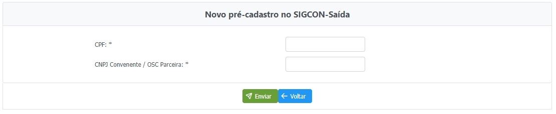 "Pré Cadastro";Como usuário externo do convenente/ OSC Parceira, preencha o CPF e CNPJ e clique em