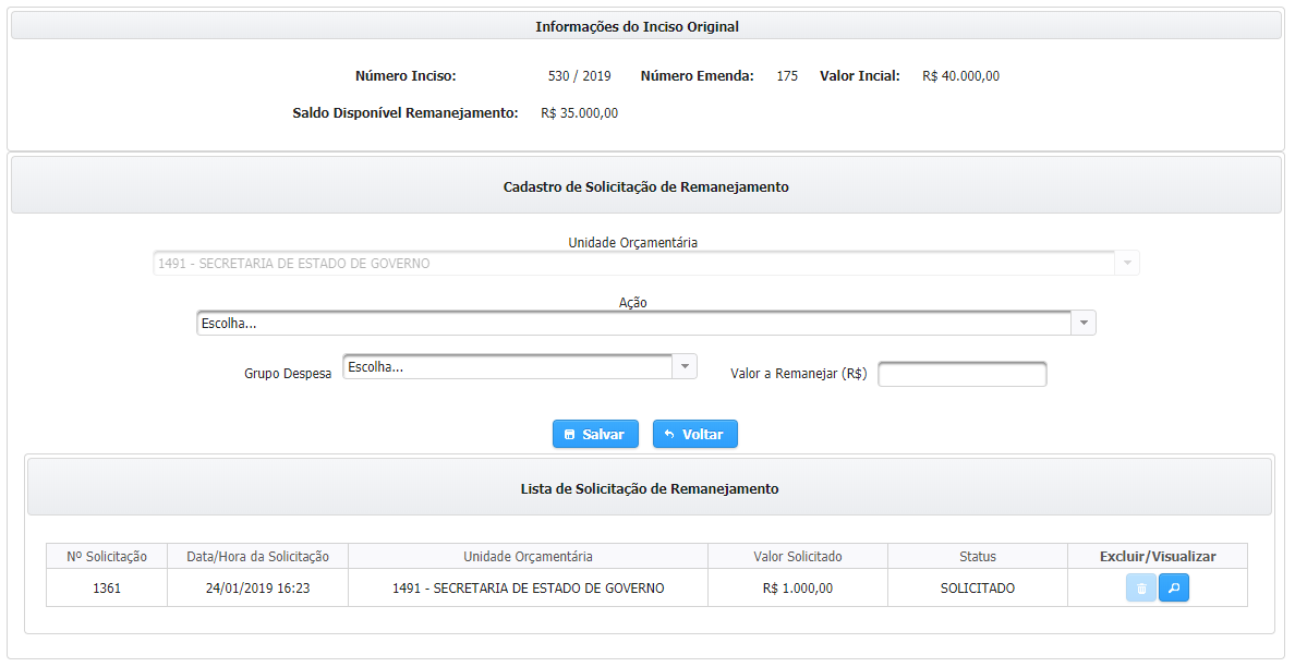 A princípio, somente o usuário "Parlamentar" poderá solicitar remanejamentos e indicações, bem como acompanhar o andamento das solicitações realizadas no SIGCON Saída. No entanto, como a delegação dessas tarefas é algo comum, o parlamentar poderá autorizar seus assessores a realizar essas tarefas com o usuário deles no SIGCON Saída.