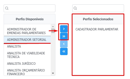 "Perfis Disponíveis"e, com o uso da seta central, encaminhe a seleção para o"Perfis Selecionados":