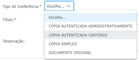 Para Documentos Digitalizados, é necessário selecionar a forma de conferência realizada no arquivo em questão, sendo elas: