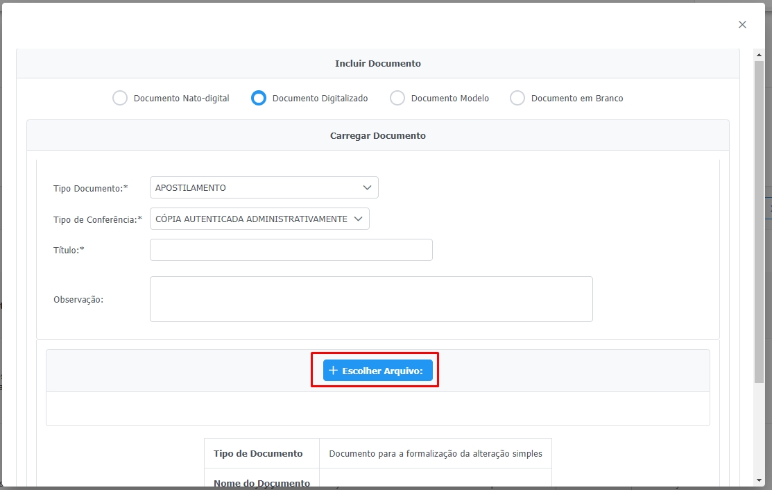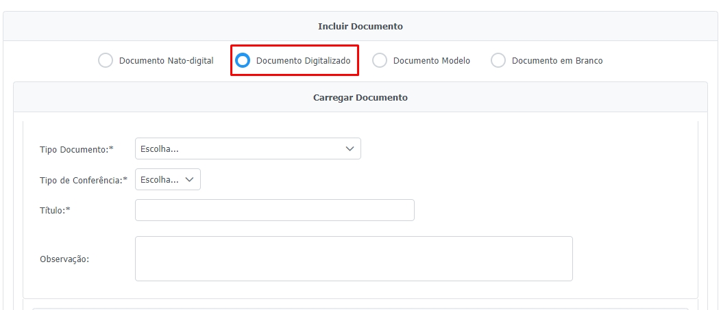 Escolha o "Tipo de Documento", um "Título" e, caso necessário, adicione alguma observação sobre o documento.