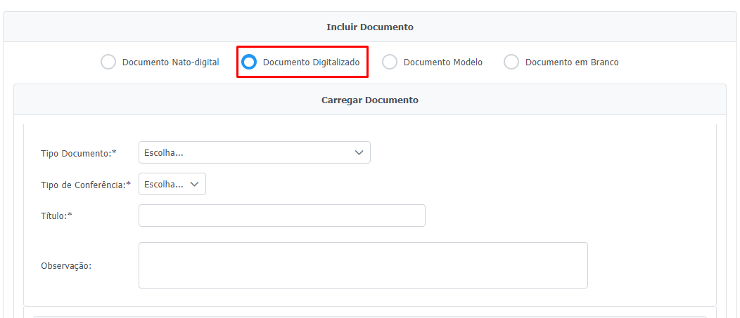 "Incluir Documento", selecione a opção "Documento Digitalizado":