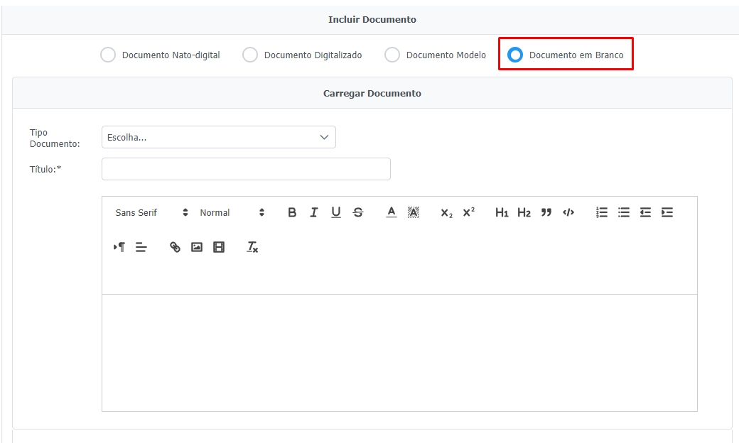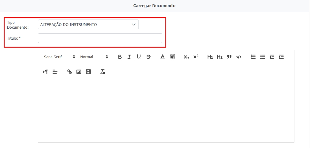 Escolha o "Tipo de Documento", um "Título" e, caso necessário, adicione alguma observação sobre o documento:
