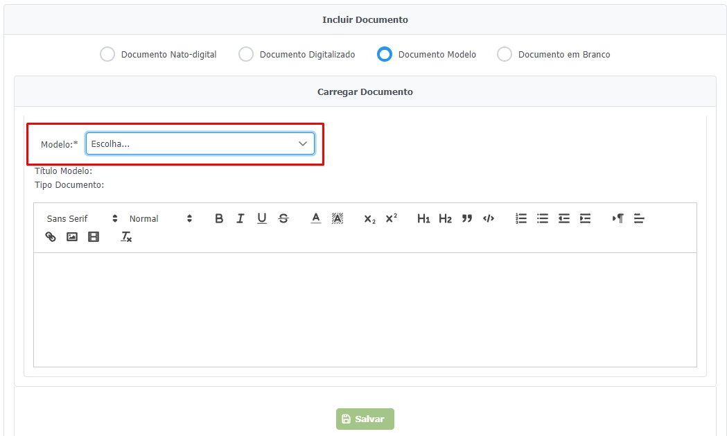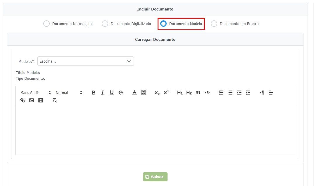 "Incluir Documento", selecione a opção "Documento Modelo":
