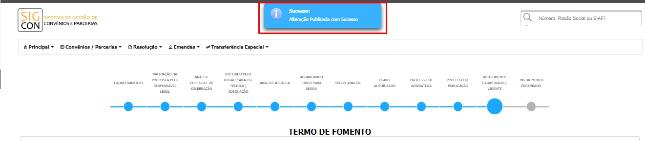 Após clicar em "Publicar Alteração", será exibida mensagem "Alteração publicada com sucesso", conforme imagem abaixo: