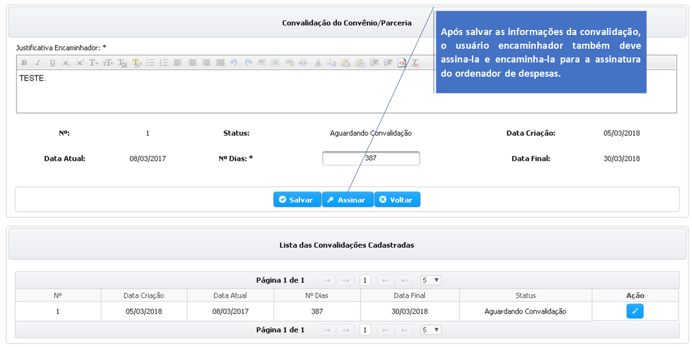 Após salvas as informações da convalidação, esta é exibida na tabela “Lista de Convalidações Cadastradas”. Além de cadastrar a convalidação, o usuário com o perfil de “Encaminhador” também deverá realizar a assinatura da convalidação e em seguida encaminhá-la para que o ordenador de despesas também a assine: