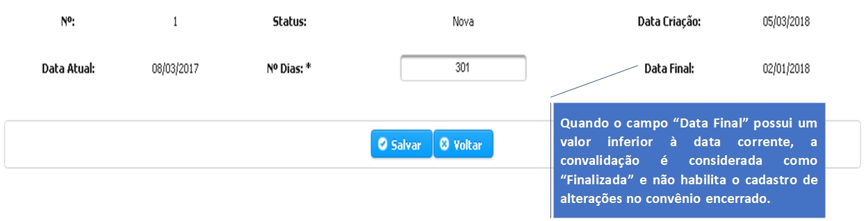 O campo "Data atual" exibe a data final da vigência do convênio, na qual tem o início o período de convalidação;