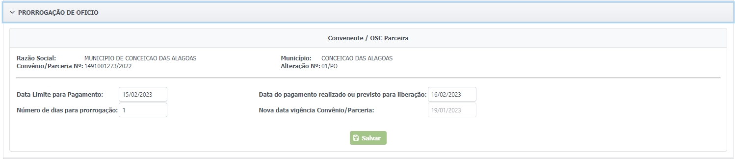 A Prorrogação de Ofício é uma prorrogação de vigência decorrente do atraso do repasse de recursos pelo Órgão Concedente.