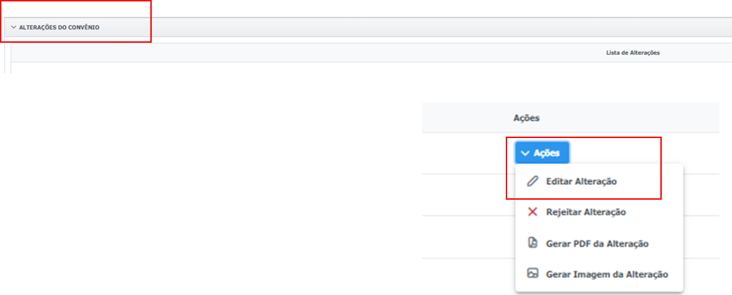 2. Acessar a aba "**Alterações do Convênio**", clicar em "**Ações**" e depois em "**Editar Alteração**":