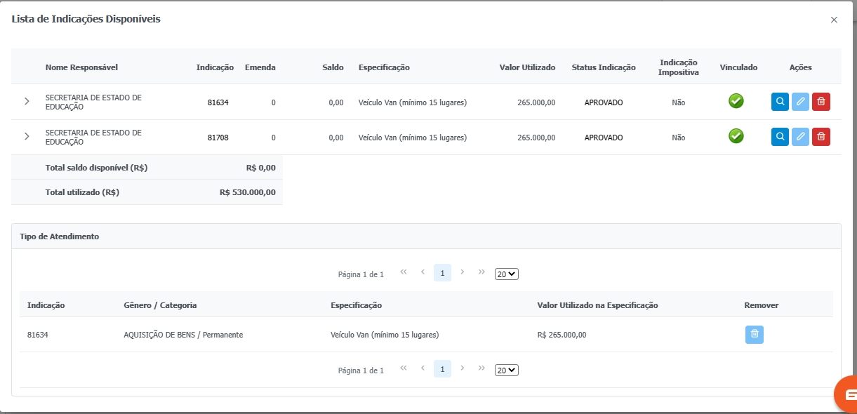 Para desvincular um valor, tem que clicar em Ações, na parte de baixo irá aparecer o valor utilizado, podendo ser alterado ou excluído.