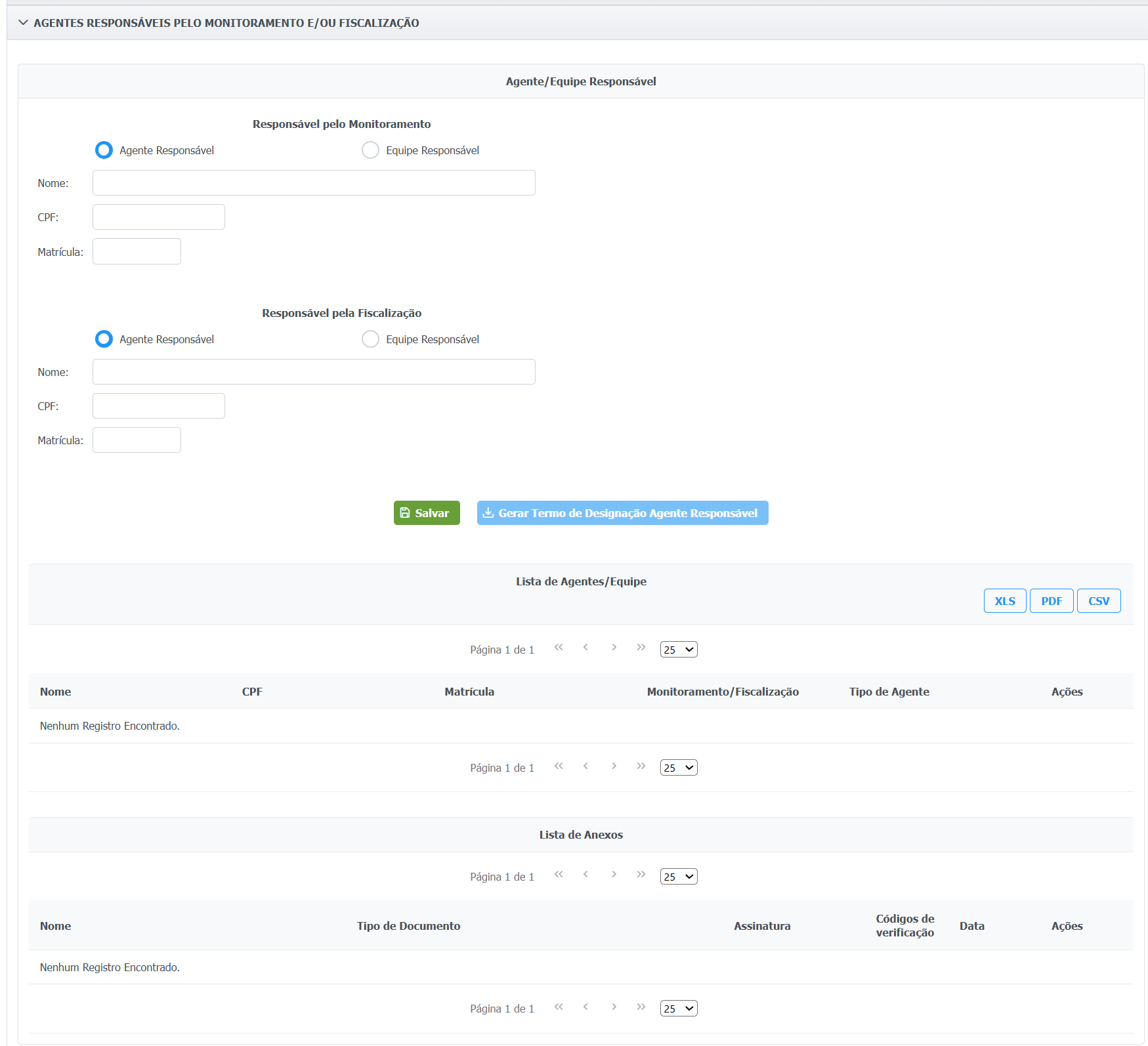 Insira na aba "Agentes Responsáveis pelo Monitoramento e/ou Fiscalização" as informações das pessoas responsáveis pelo monitoramento e/ou fiscalização do instrumento:
