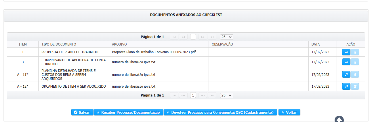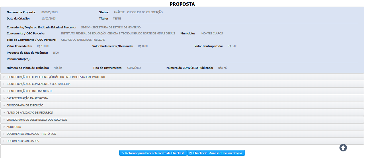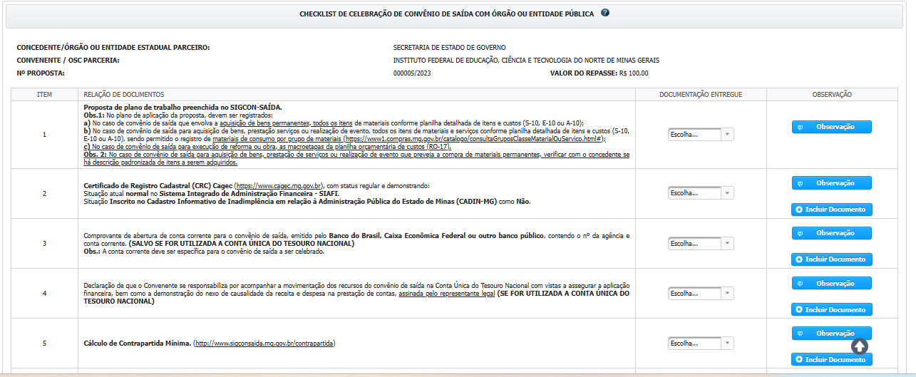 Neste momento, o usuário do Concedente/OEEP recebe a Proposta do Plano de Trabalho e verifica se toda a documentação que consta no checklist está adequada ou se necessita de ajustes.