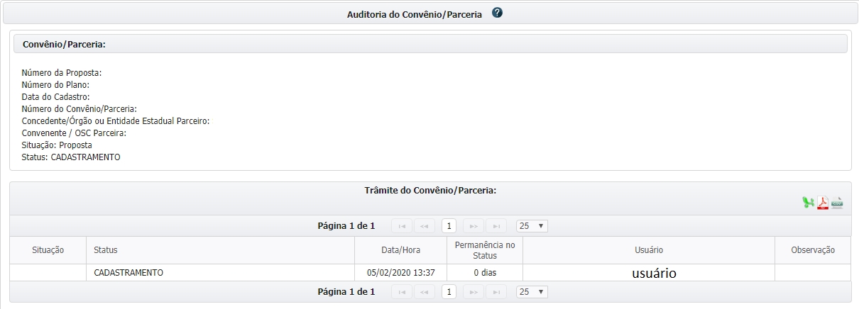 A aba "Auditoria" serve para registrar todo o histórico de movimentações na proposta ou plano e por quem foi realizada, bem como a data e a hora da operação: