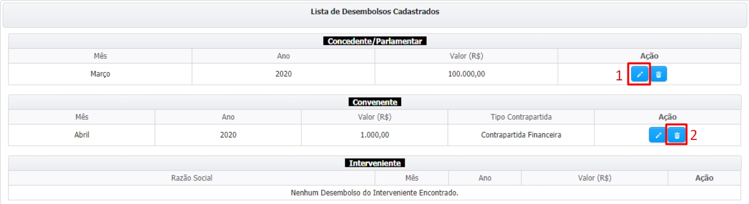 O valor estará disponível na "Lista de Desembolsos Cadastrados". Na coluna "Ação", clique no ícone de lápis (1) para editar ou no ícone de lixeira (2) para excluir:
