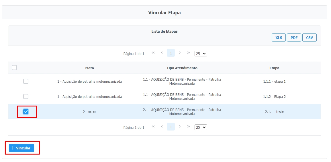 Clique no ícone de "+" (6) da coluna "Vincular Etapa":