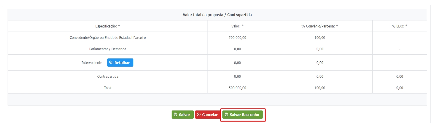 É fundamental que o Valor Total do Demonstrativo de recursos seja equivalente ao total do "Valor total da proposta / Contrapartida", do contrário o so botão salvar não irá ficar habilitado. Tudo que foi digitado permanecera como rascunho, não perdendo nada que foi digitado.