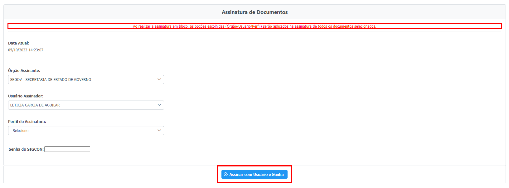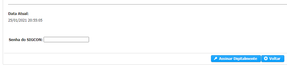 Selecione corretamente os campos de Órgão assinante, usuário e perfil de assinatura, digite a senha do SIGCON Saída e clique em