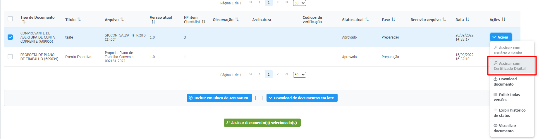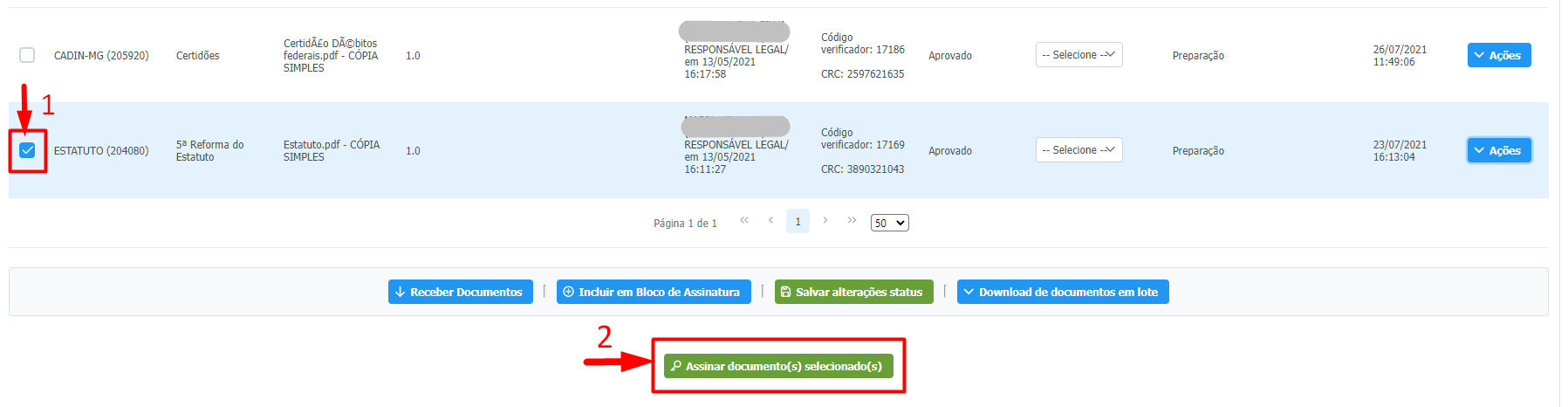 selecione o(s) documento(s)(1)e clique em"Assinar documento(s) selecionado(s)"(2):