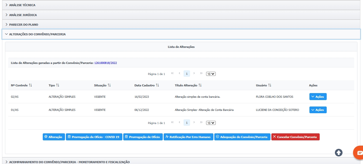 Para alterar um convênio, é necessário pesquisa-lo e acessá-lo pela ação “Editar”. As alterações são cadastradas na aba de “Alterações do Convênio”: