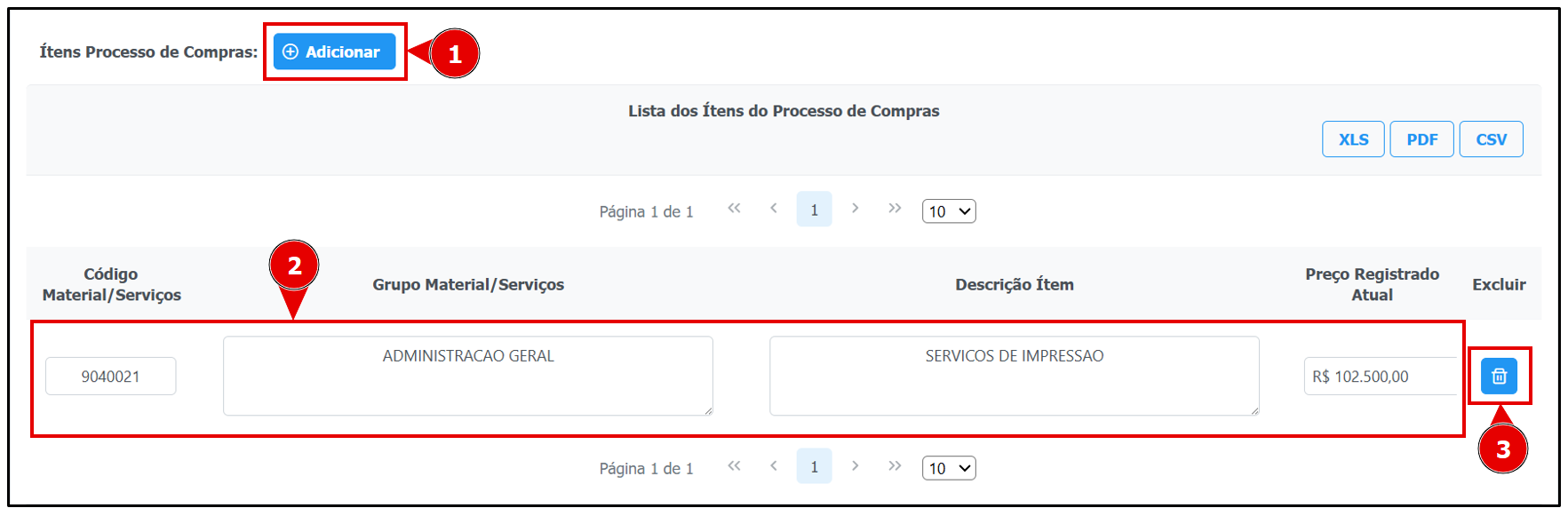 > 1. Clique no botão "**Adicionar**" para incluir um novo item;