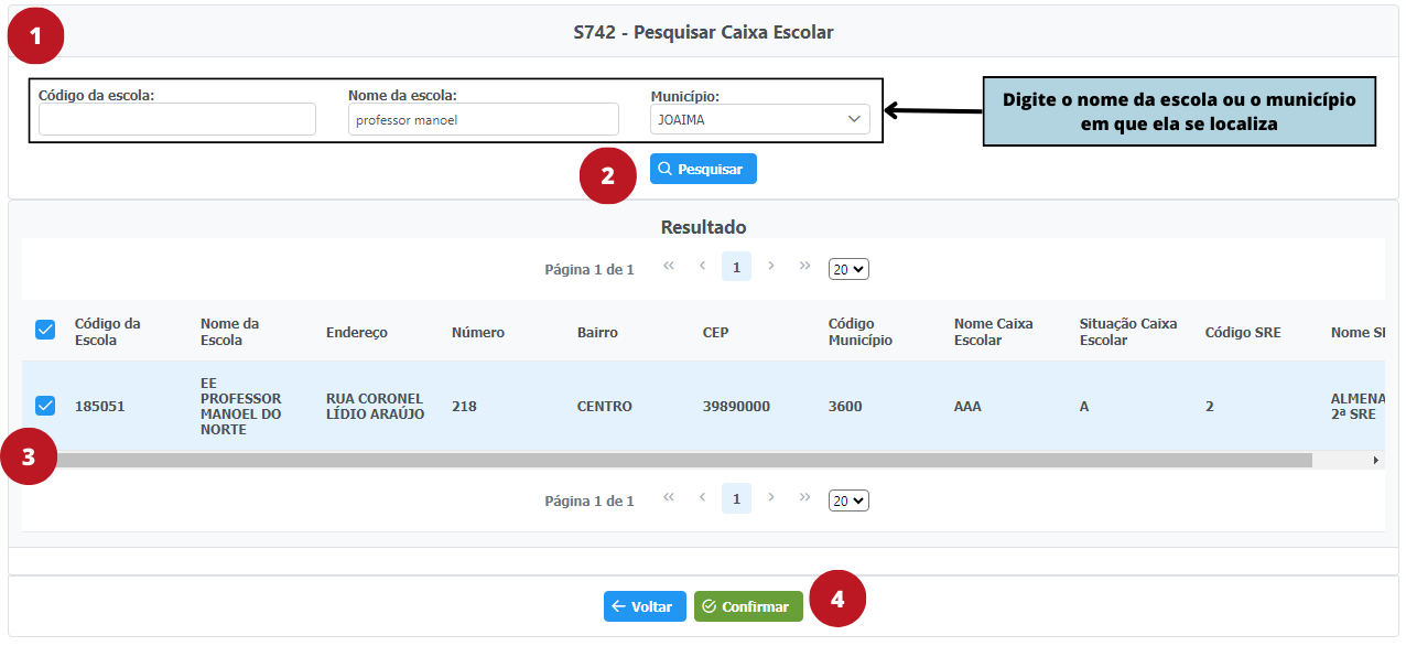 Caso o usuário não saiba previamente o código da escola, é possível realizar uma pesquisa através do município ou nome da escola nos campos de busca.