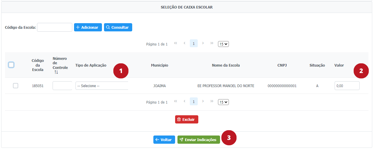 As escolas selecionadas são exibidas na tabela “Seleção de Caixa Escolar”, na qual deverão ser preenchidas as informações referente ao tipo de aplicação e ao valor de cada indicação.