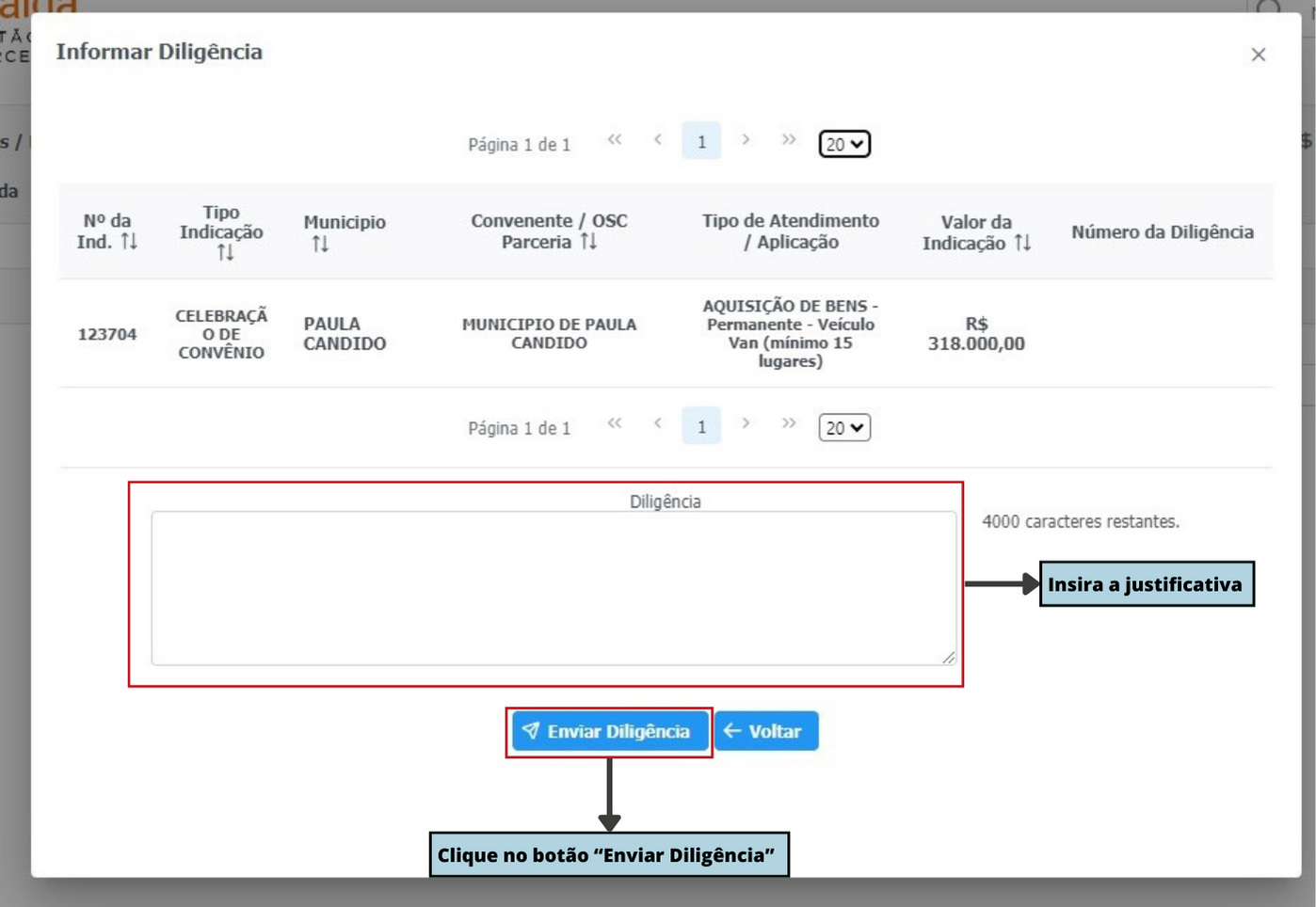 4. Uma nova tela será aberta com as informações da indicação selecionada, um campo de texto para escrever e um botão para Enviar a diligência conforme imagem abaixo: