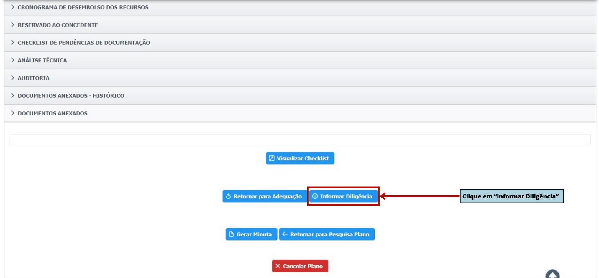 4. No Plano de trabalho localize o botão "Informar Diligência" na parte inferior da página, conforme imagem abaixo.