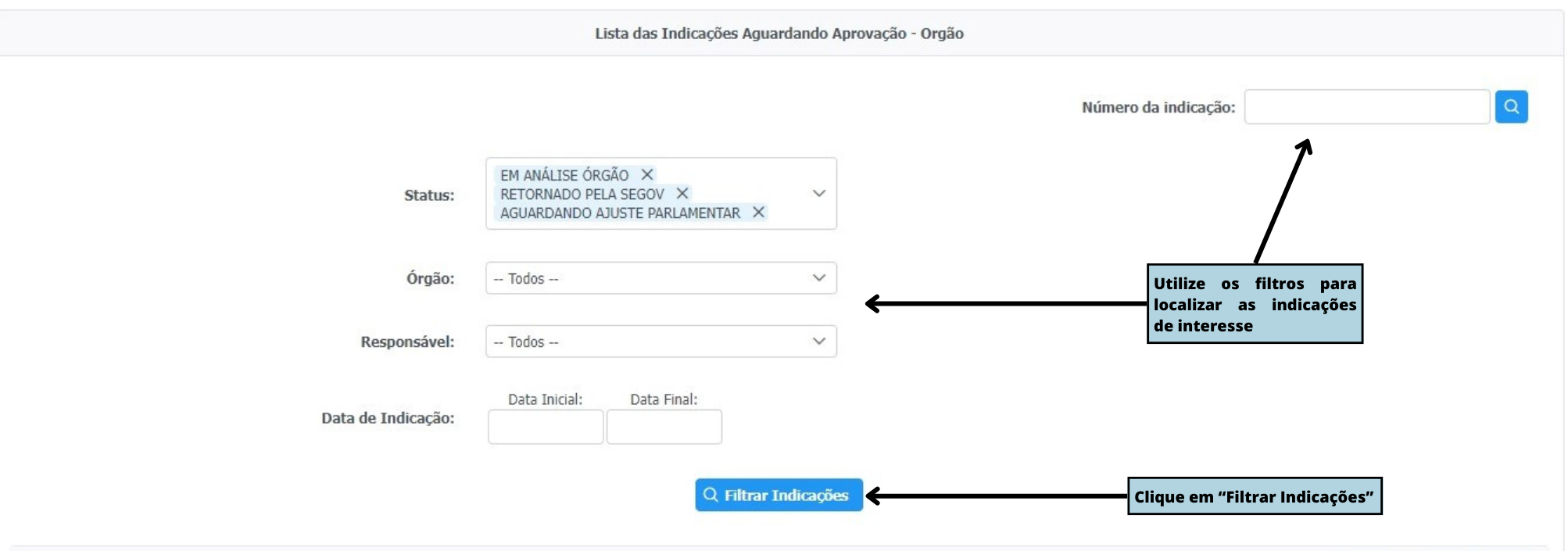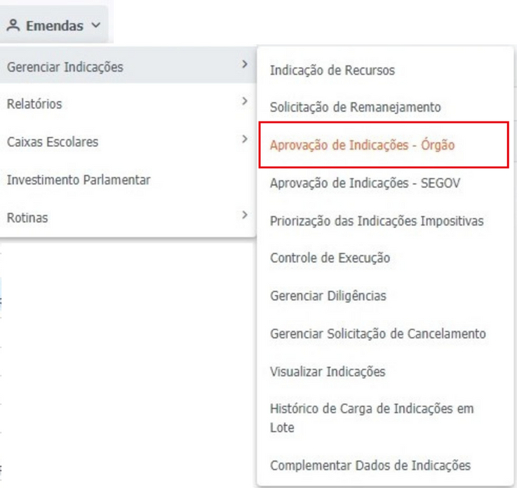 Emendas > Gerenciar Indicações > Aprovação de indicação - órgão, conforme a imagem abaixo: