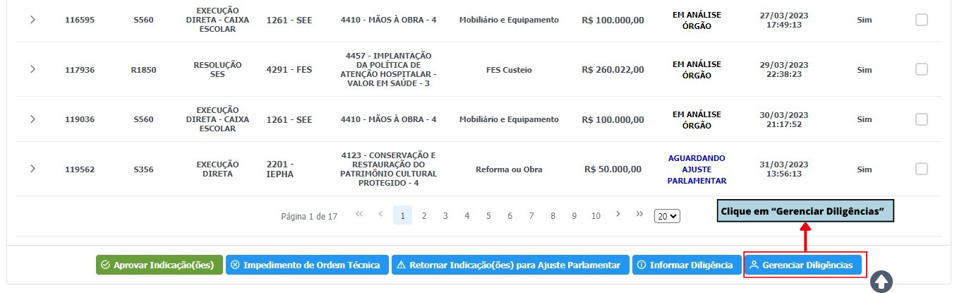 O menu "Gerenciar diligências" também está disponível na tela de "Aprovação de Indicações - Órgão", conforme imagem abaixo: