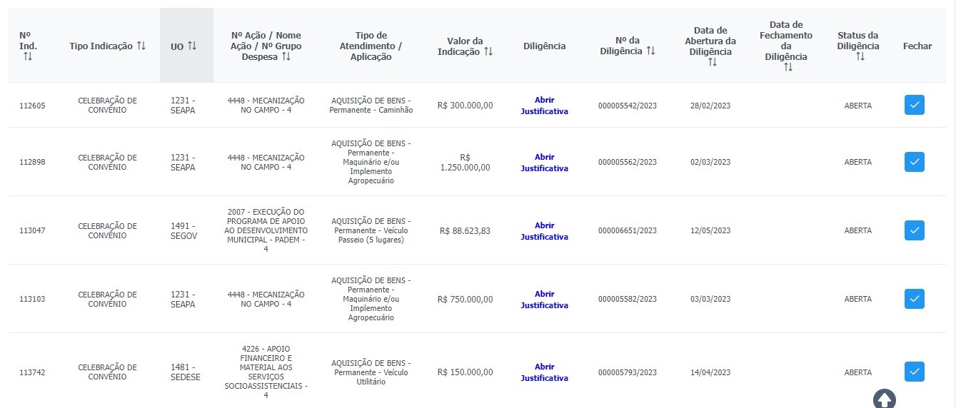 Após clicar no botão uma nova tela será aberta listando todas as diligencias informadas: