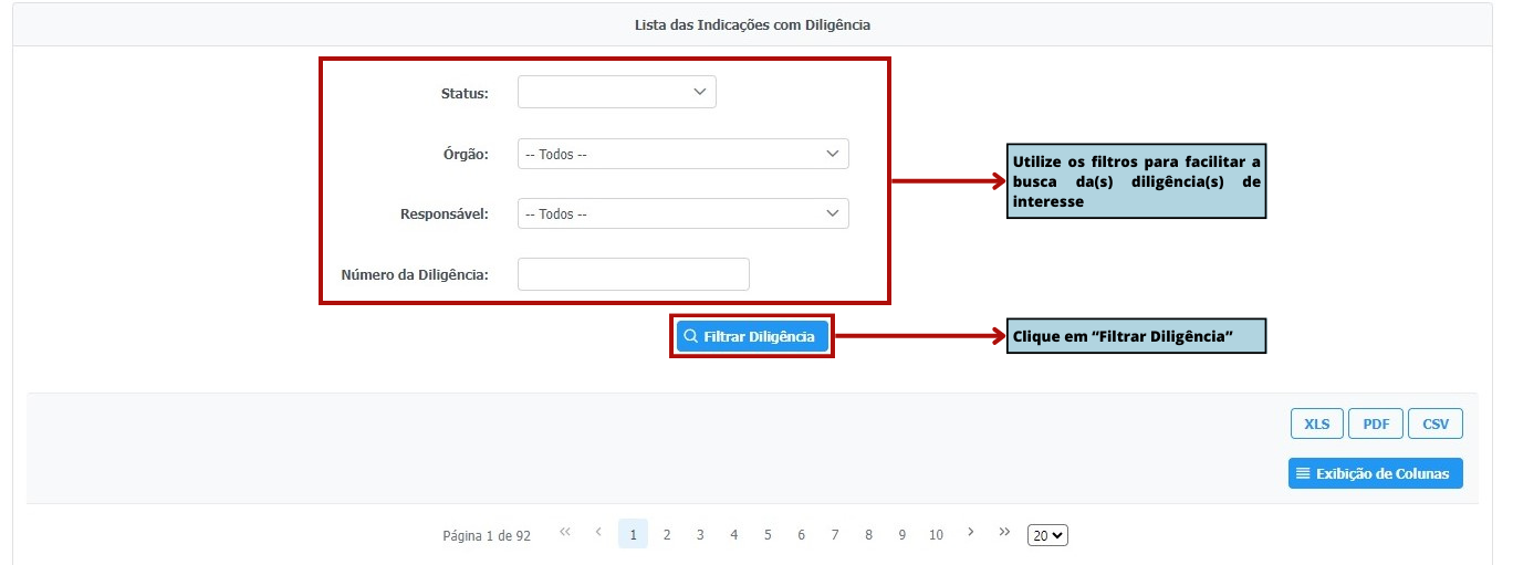 Após preencher os campos desejados é só clicar no botão "Filtrar Diligência" que a lista será recarregada conforme o filtro selecionado.