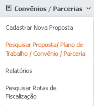 Acesse o submenu "Pesquisar Proposta/ Plano de Trabalho / Convênio / Parceria" no menu "Convênios / Parcerias".