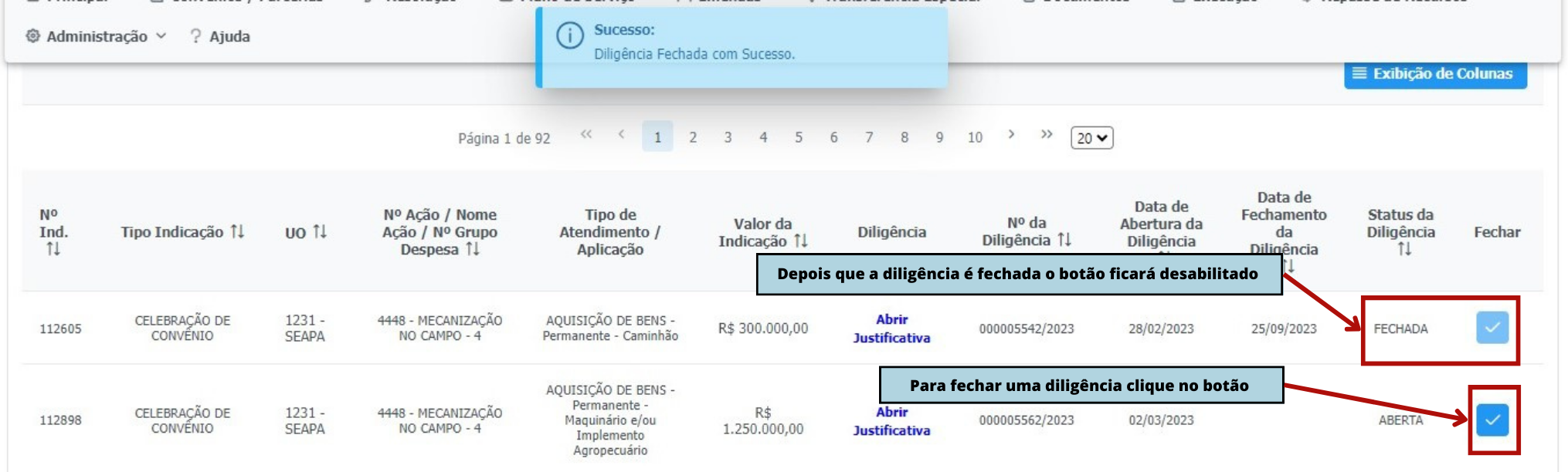 Depois que a diligencia é fechada um e-mail será enviado para o parlamentar com informações do fechamento da diligência e o botão ficará desabilitado conforme imagem abaixo: