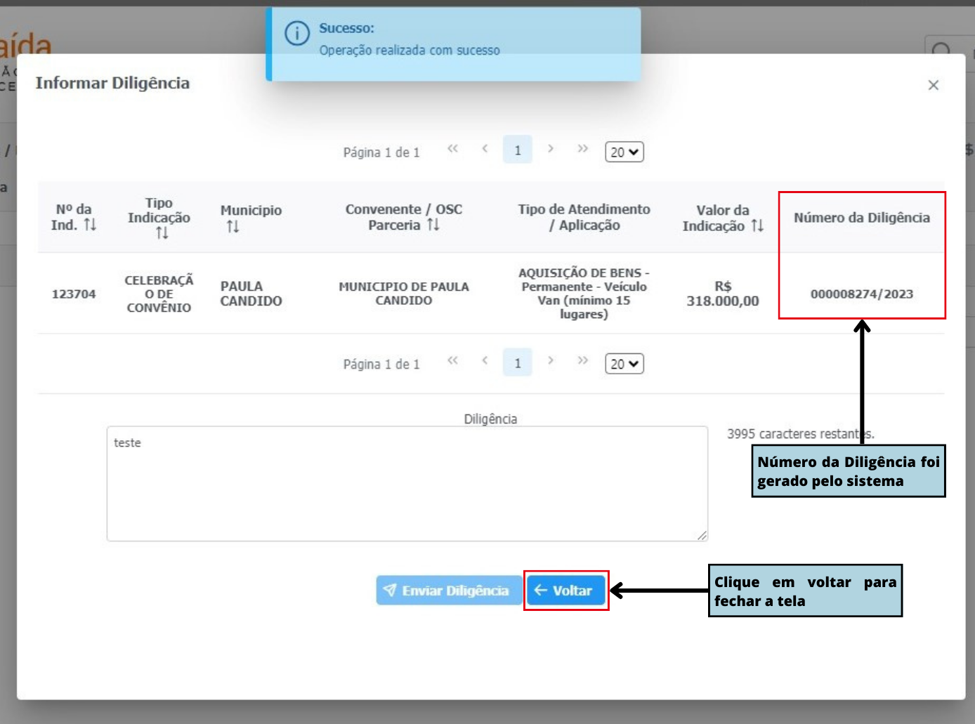 5. Após clicar no botão Enviar diligência um número de controle será gerado e exibido na coluna número da diligência na tabela com informações da indicação conforme a imagem abaixo: