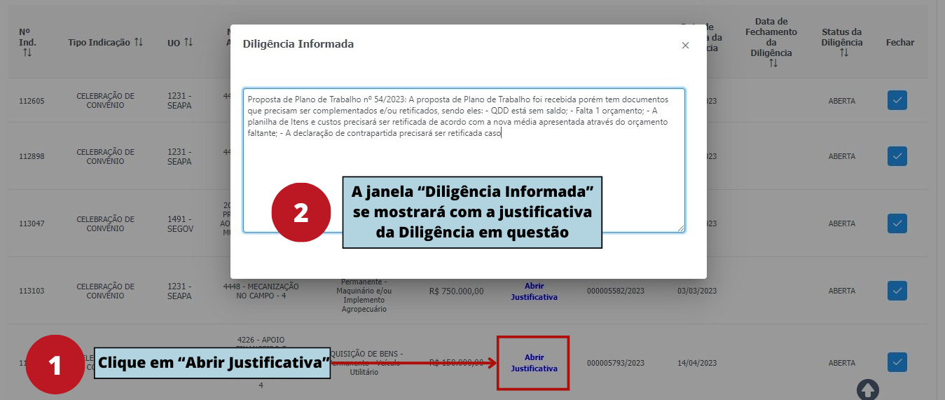 Para visualizar a justificativa da diligência clica no link "Abrir diligência" conforme imagem abaixo: