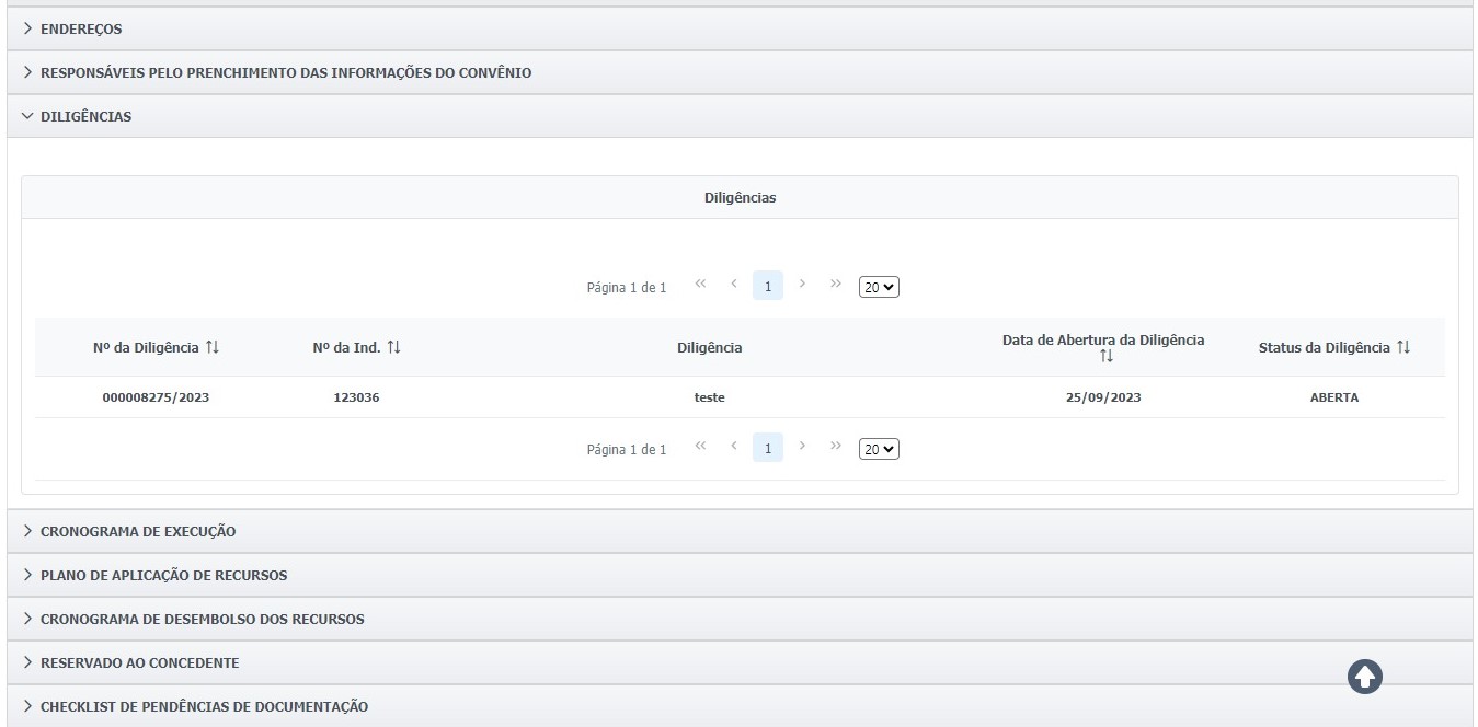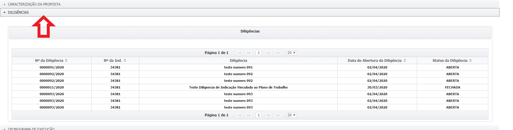As diligências também poderão ser visualizadas no plano de trabalho. Para visualizar é só clicar em expandir a aba diligencia conforme imagem abaixo.