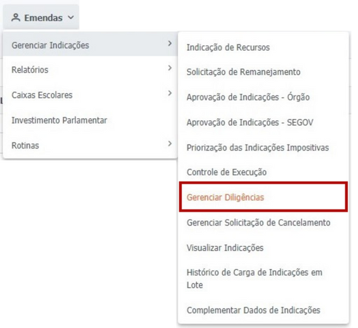 Emendas > Gerenciar Indicações > Gerenciar Diligência, conforme a imagem abaixo: