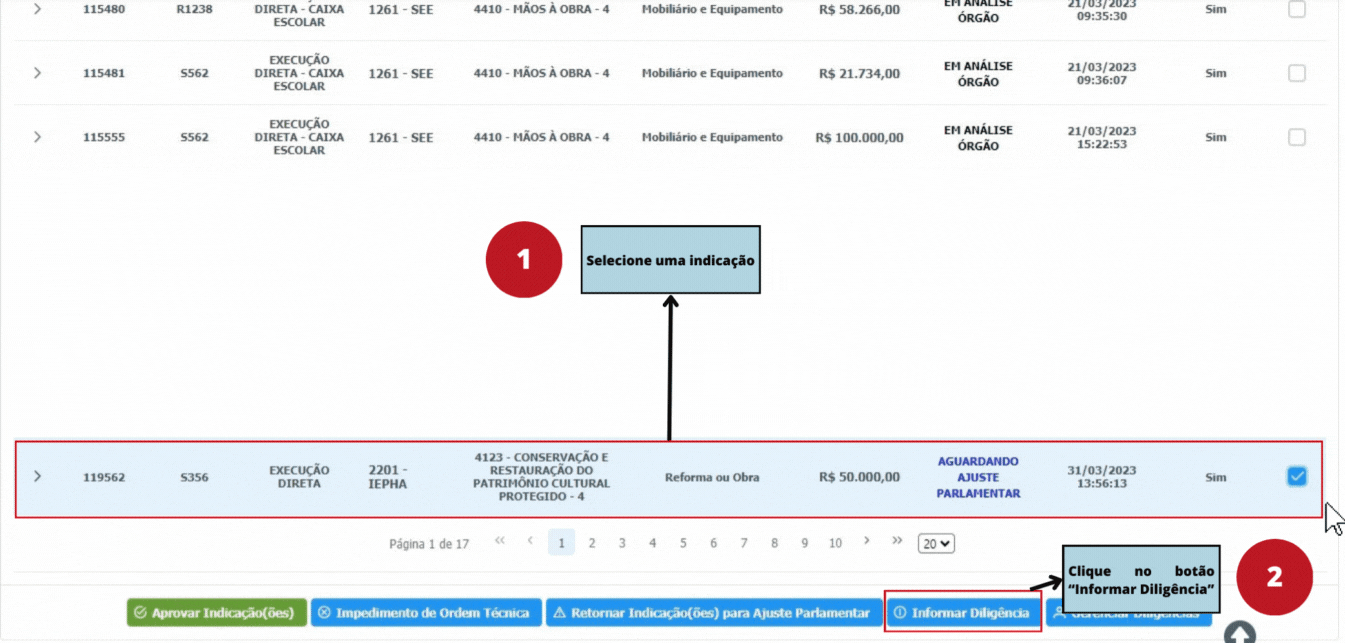 3. Selecione uma indicação e clique no botão "Informar Diligência" para informar a diligência: