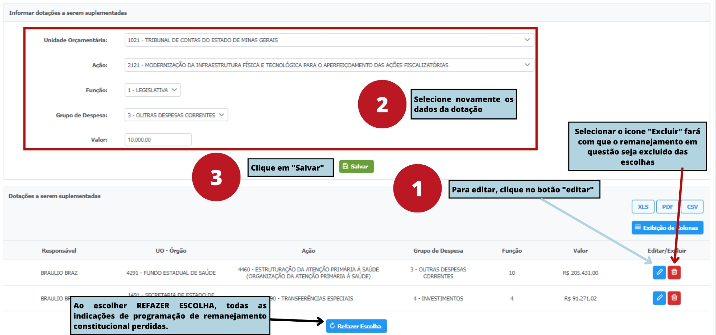 Caso o usuário deseje alterar as informações do saneamento e do montante direcionado para o remanejamento, conforme preenchido orientado na seção Saneamento, é necessário que ele clique no comando “Refazer Escolha”. Contudo, essa opção irá apagar os registros das programações orçamentárias que o usuário já preencheu no remanejamento.