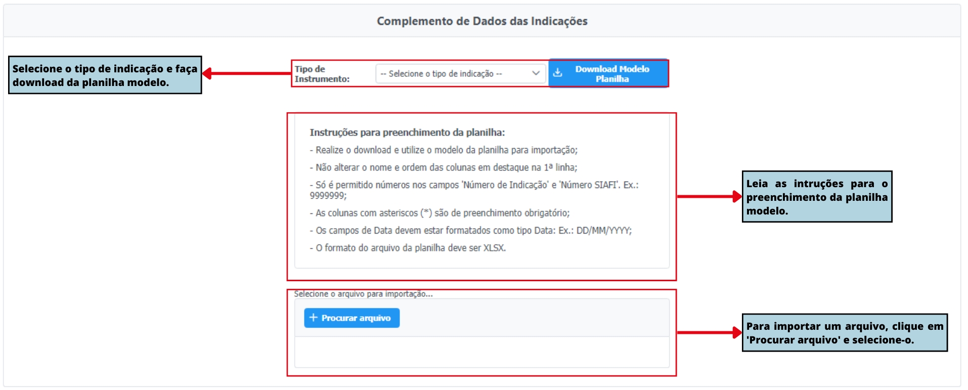 Após preencher e salvar a planilha modelo, clique no botão "Procurar arquivo", localize e selecione a planilha com as alterações realizadas.