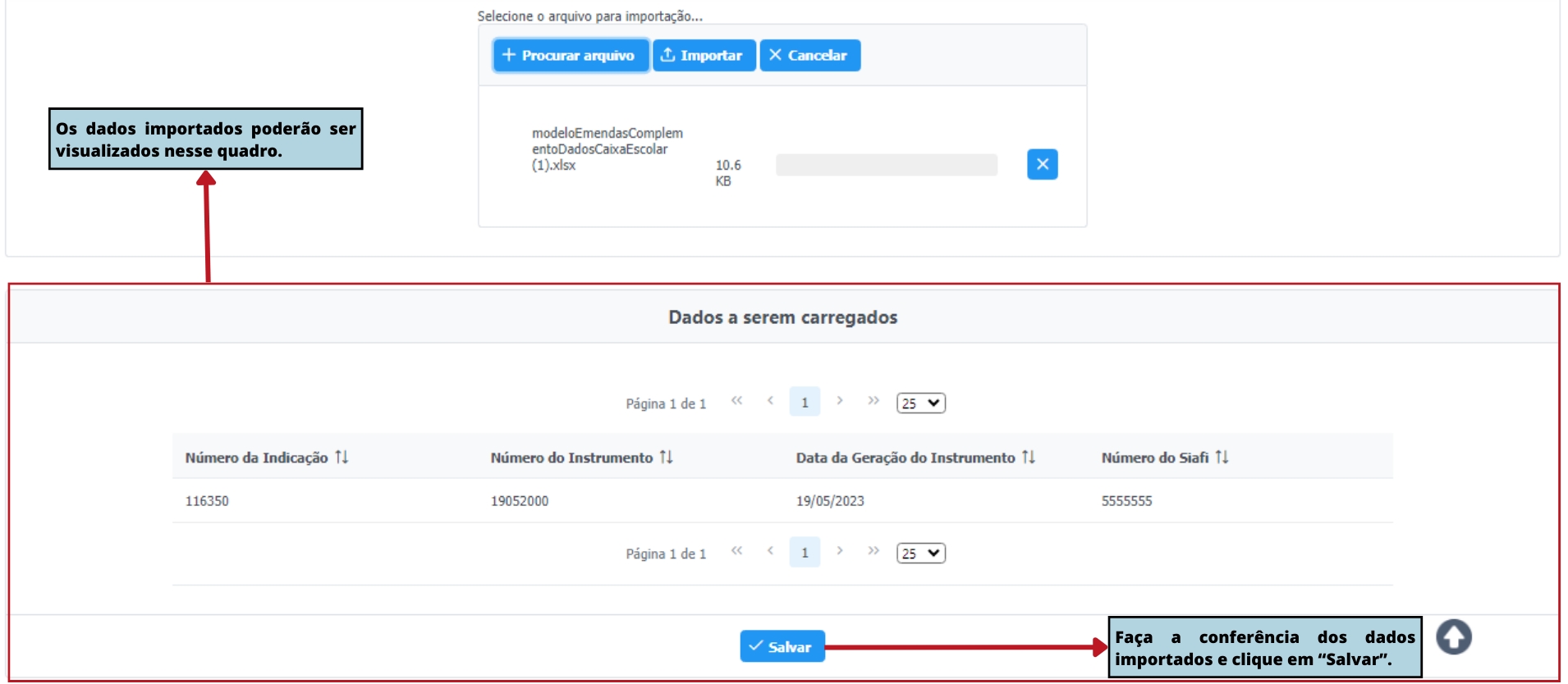 Após adicionar a planilha, clique no botão "Importar" para concluir. O sistema exibirá uma mensagem confirmando o sucesso da importação.