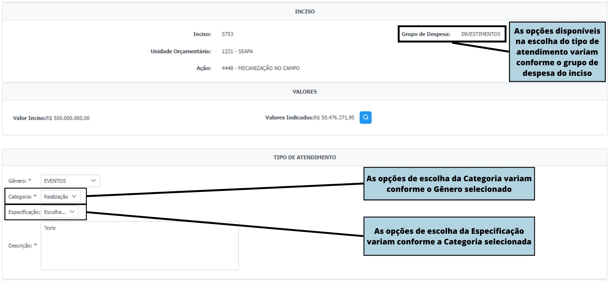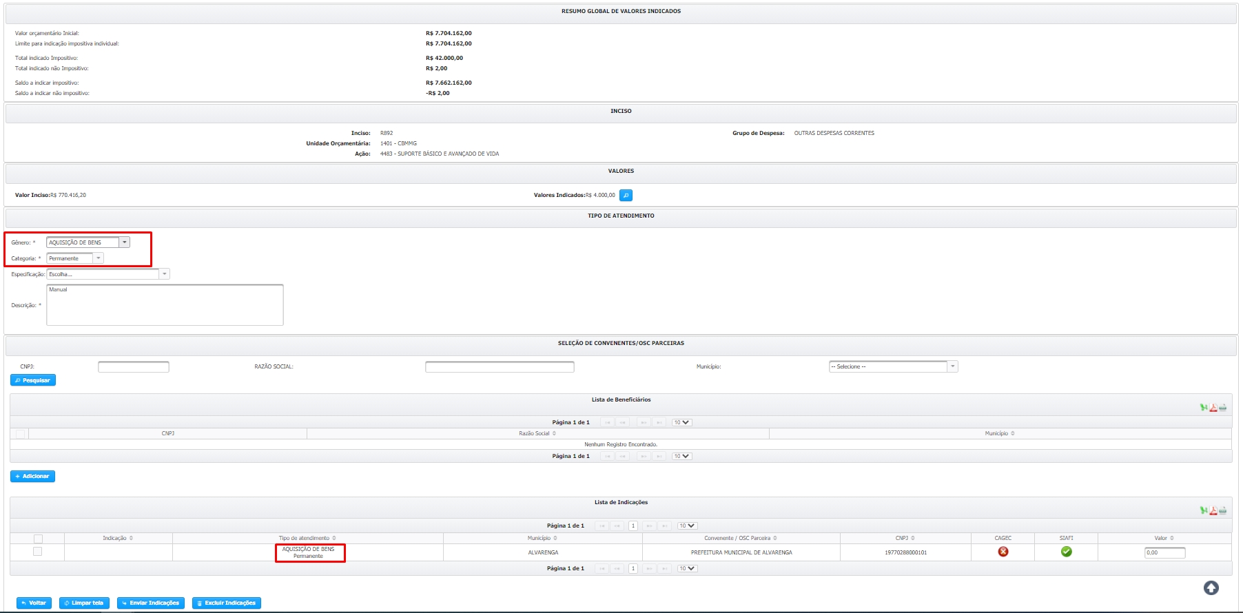 Os campos "Valor Utilizado" e "Valor Empenhado" só podem ser editados no mesmo exercício em que a indicação foi realizada.