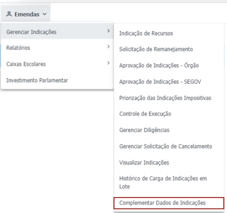 Para indicar os recursos de emenda parlamentar o usuário deve acessar o menuEmendas > Gerenciar Indicações > Indicação de Recursos, conforme a imagem abaixo: