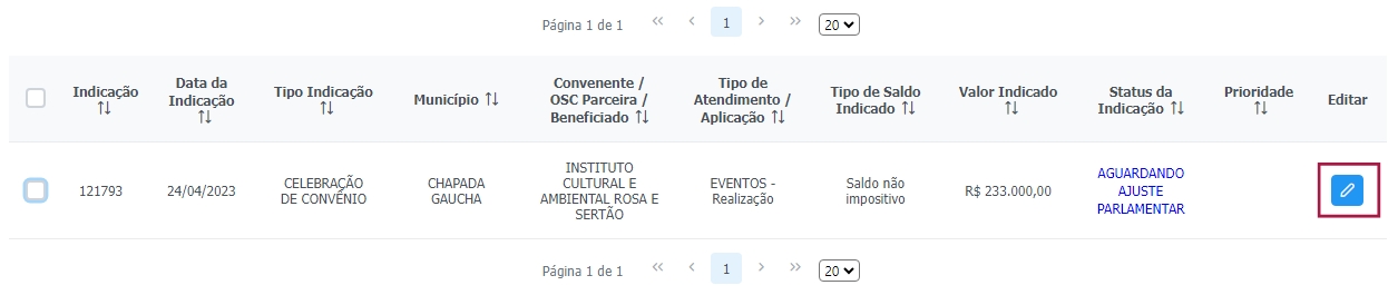 Para realizar as alterações necessárias na indicação retornada, clique no ícone "Editar"