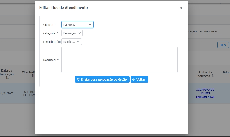 Sempre que uma indicação é retornada pelo Órgão para ajuste, seu status é alterado para Aguardando ajuste parlamentar, permitindo a edição do tipo de atendimento. Além disso, um e-mail de notificação é enviado ao parlamentar informando que há uma indicação que precisa de ajustes.
