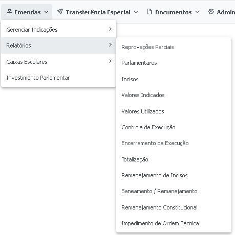 Os remanejamentos e indicações realizados podem ser consultados nas próprias telas em que foram solicitados, mas o SIGCON-SAÍDA permite a visualização concisa dessas informações em relatórios. Os relatórios podem ser acessados a partir do menu Emendas > Relatórios