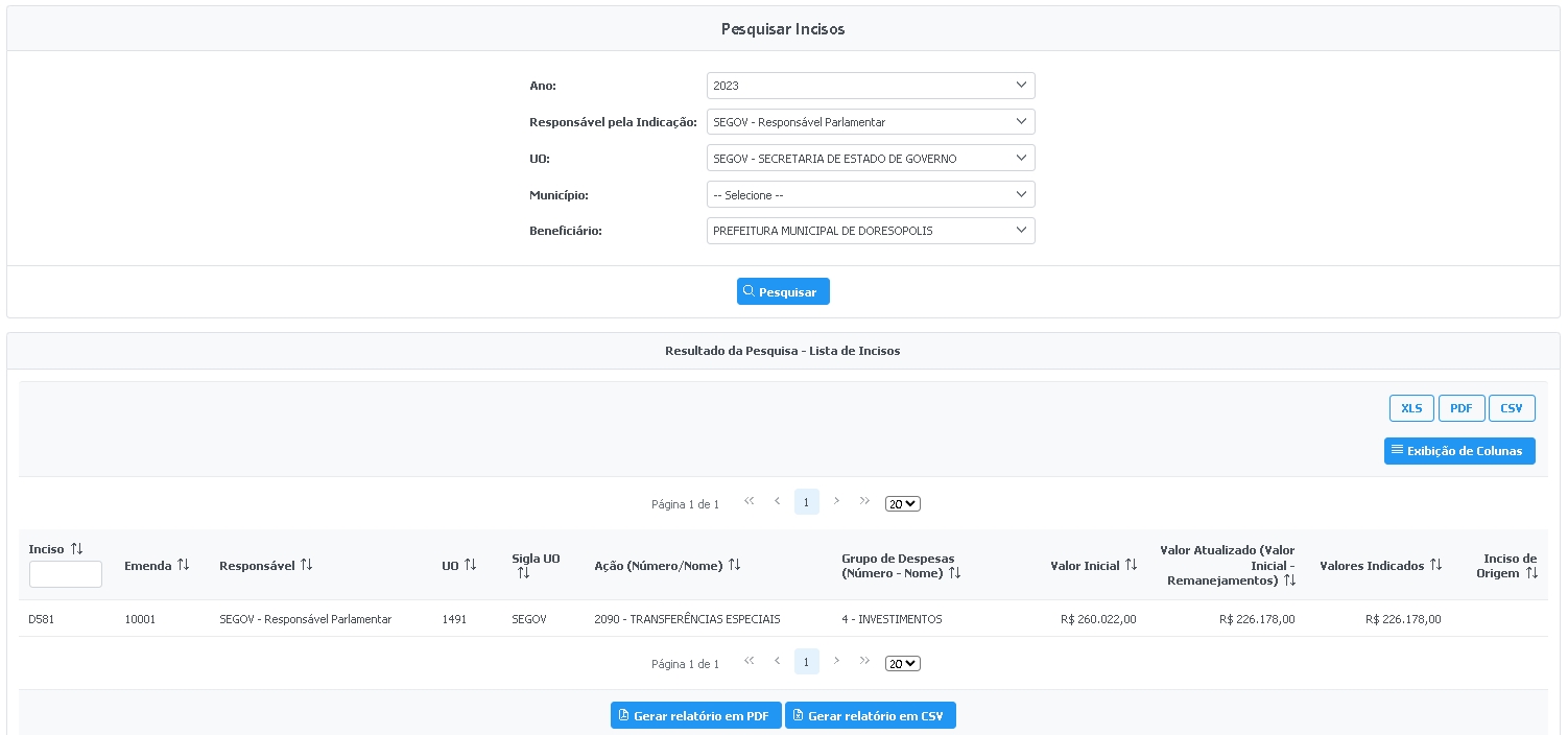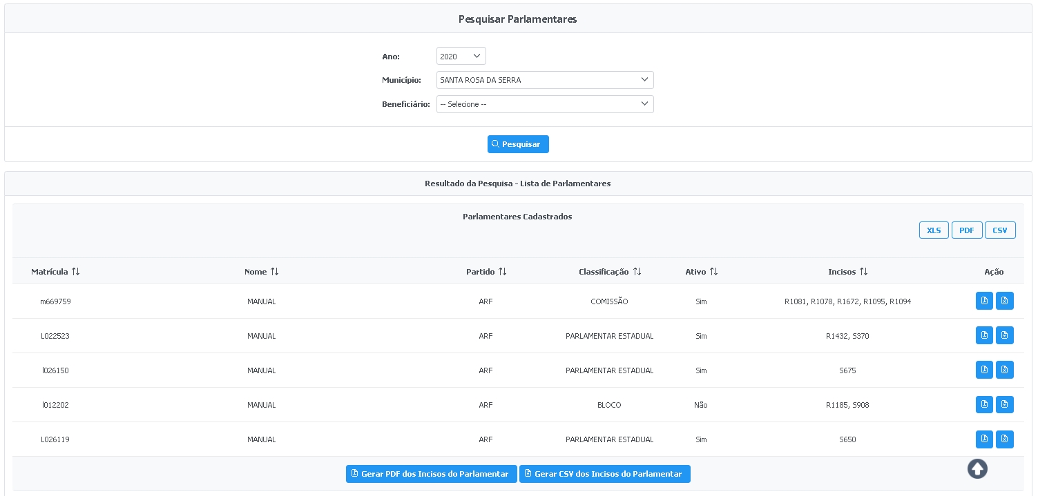 , são apresentados os próprios parlamentares, seus incisos correspondentes e o status de cada perfil. Nesta página, é possível gerar relatórios individuais para cada parlamentar, focando nos seus respetivos incisos, e aplicar filtros por município ou beneficiário. Uma vez que o relatório é gerado, o usuário terá acesso às informações essenciais dos incisos do(s) parlamentar(es) selecionado(s), que incluem: Unidade orçamentária(UO) ou órgão responsável, grupo de despesa, ação, valor inicial, valor atualizado (VR inicial - remanejamentos), valores indicados, valores reprovados /cancelados e inciso de origem.